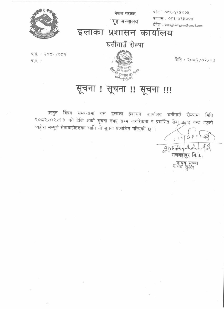 © सर्वाधिकार सुरक्षित इलाका प्रशासन कार्यालय, घर्तिगाँउ, रोल्पा
