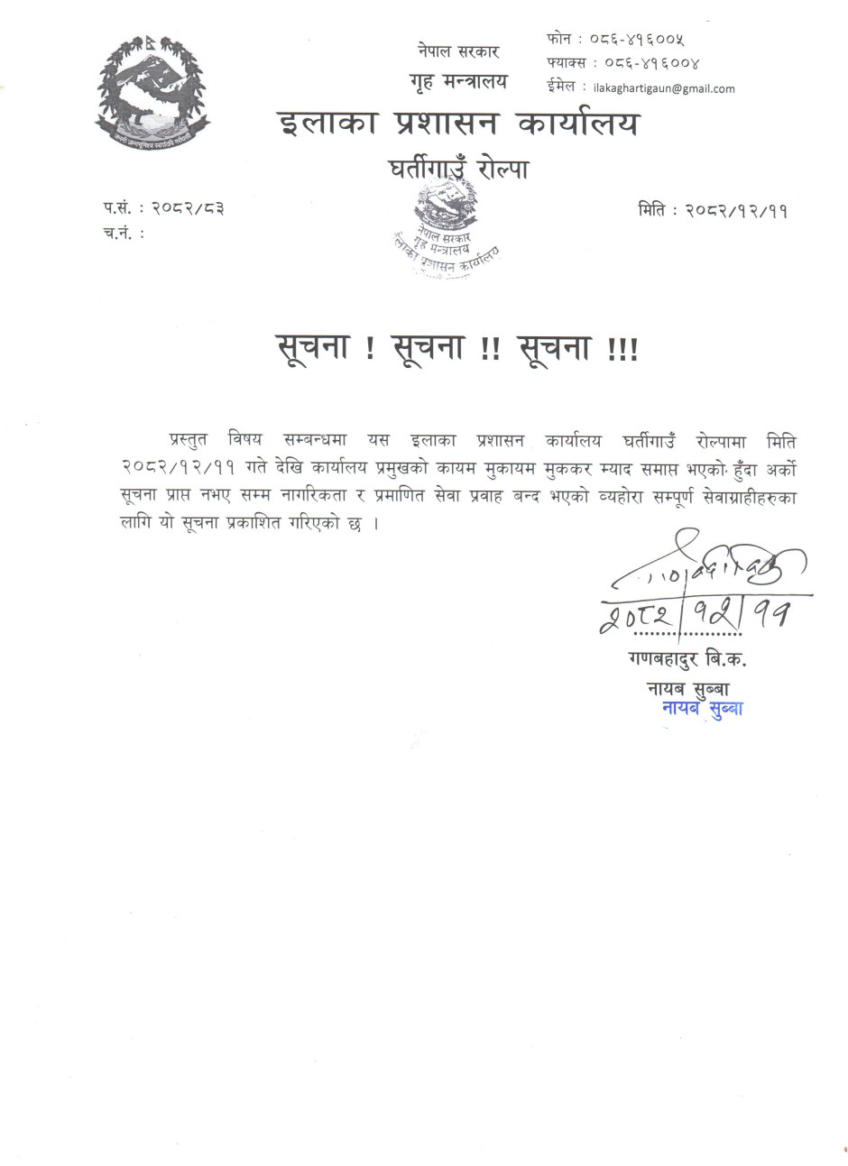 © सर्वाधिकार सुरक्षित इलाका प्रशासन कार्यालय, घर्तिगाँउ, रोल्पा
